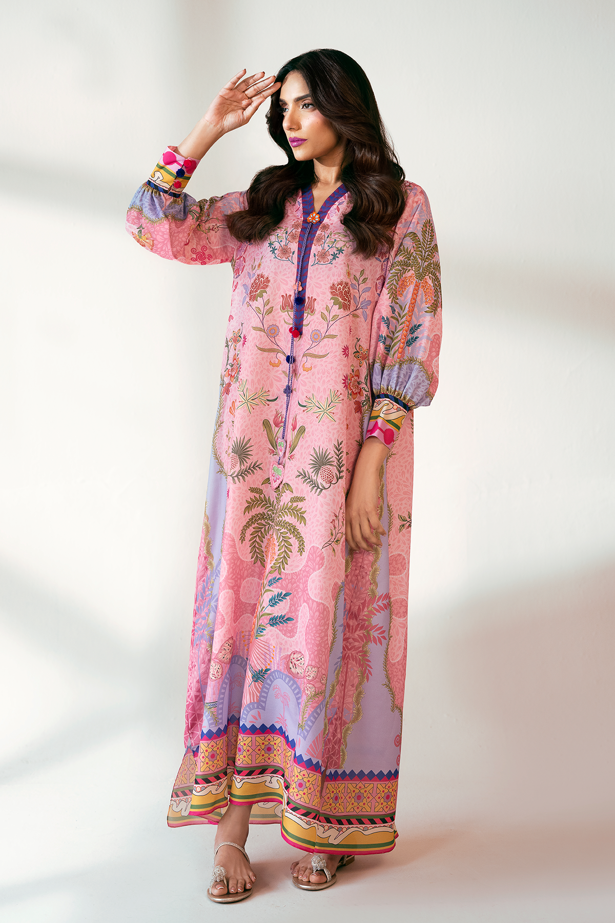 The premium blend meets modern artistry in this floor-length Kaftan. Designed with a straight silhouette and a fluid, flowy fit, it features wide sleeves and intricate embroidered and fun charms in the neckline for a look that is as comfortable as it is striking.