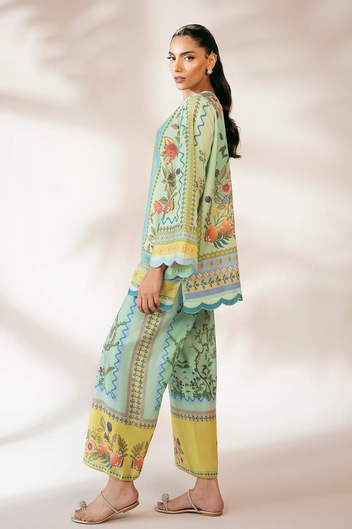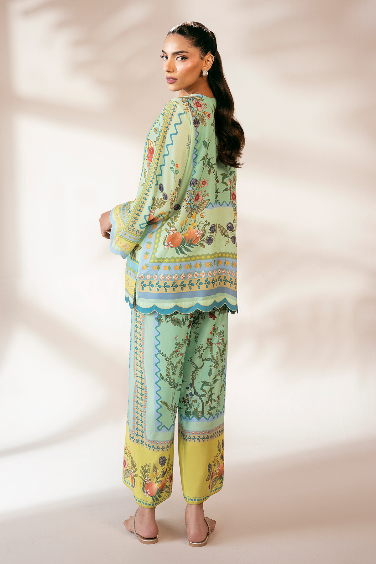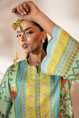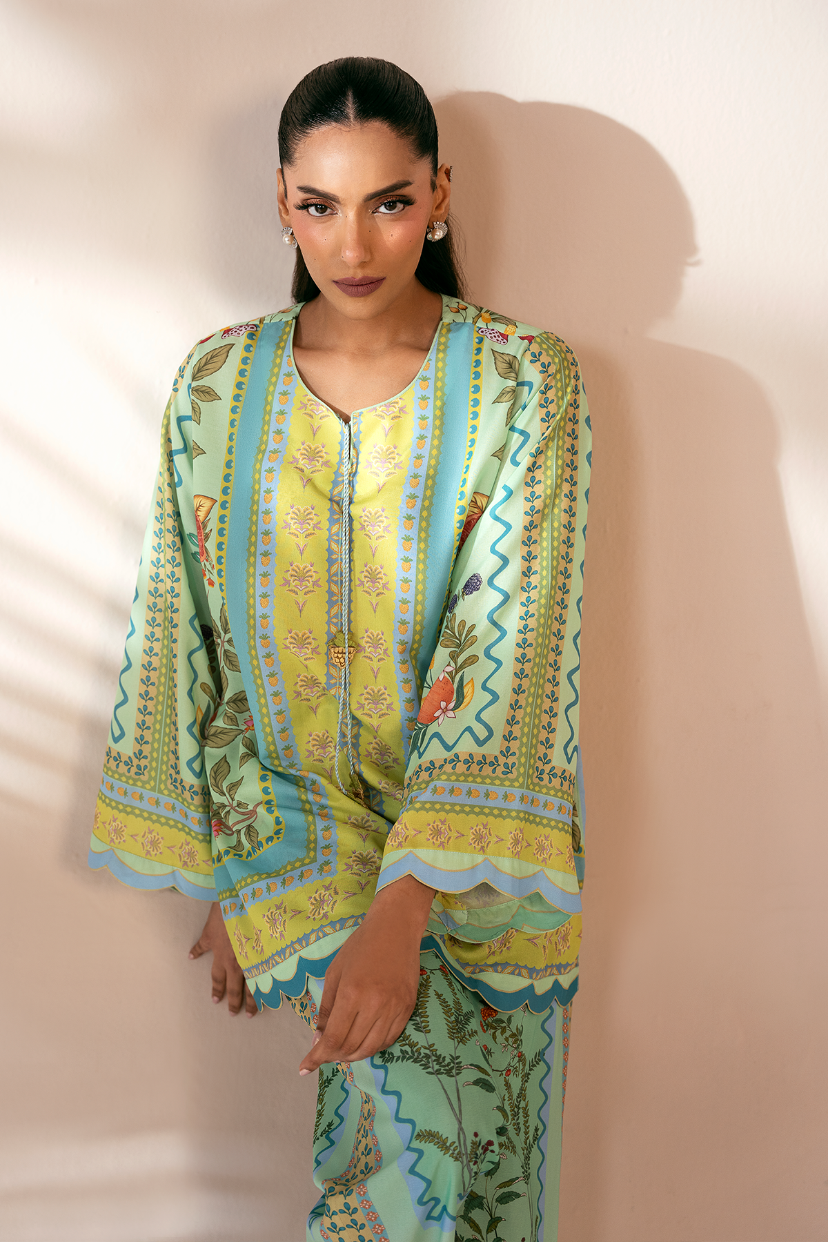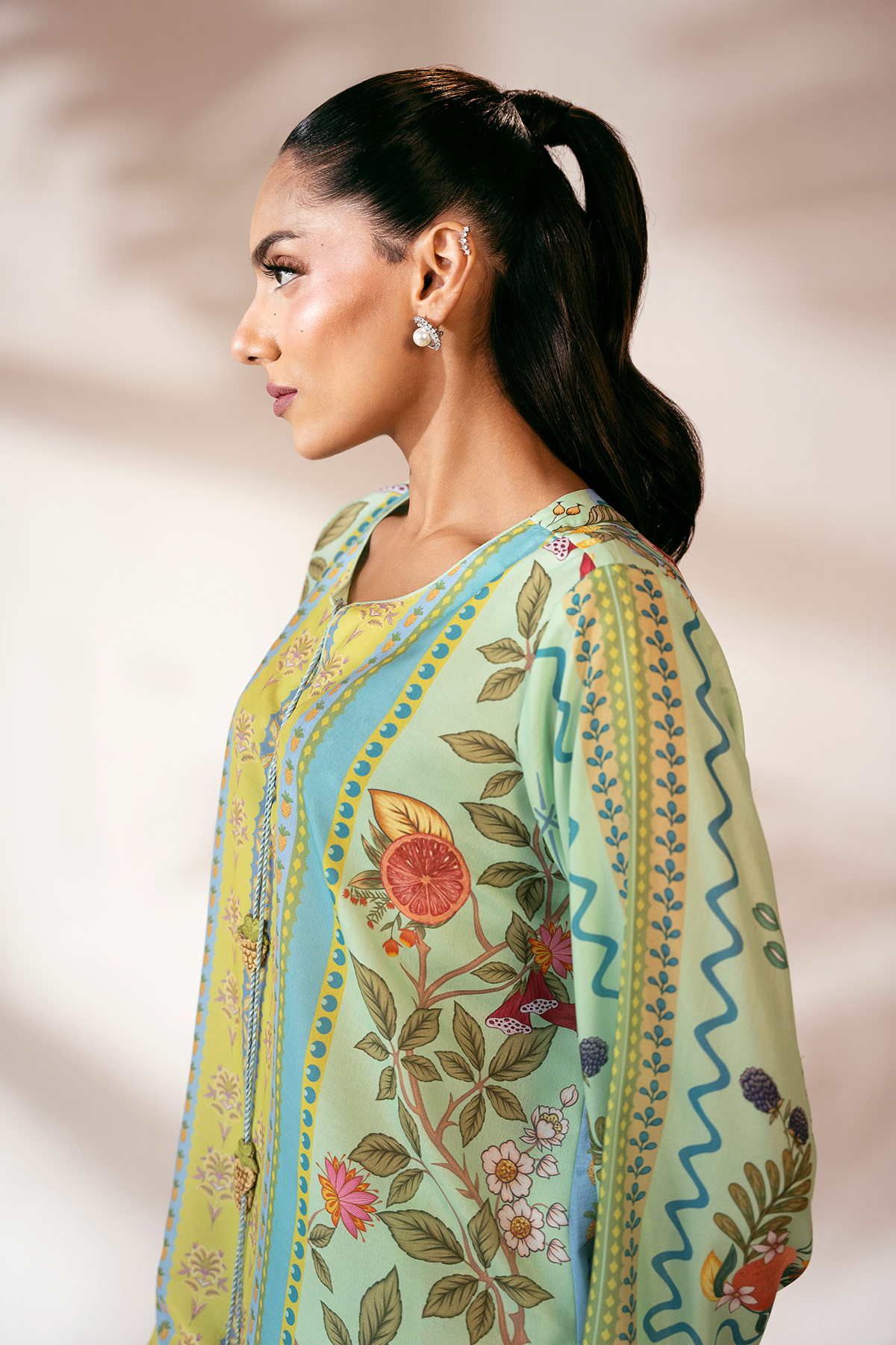 - Details: Digital print With Embroidered Charms in the Neckline.